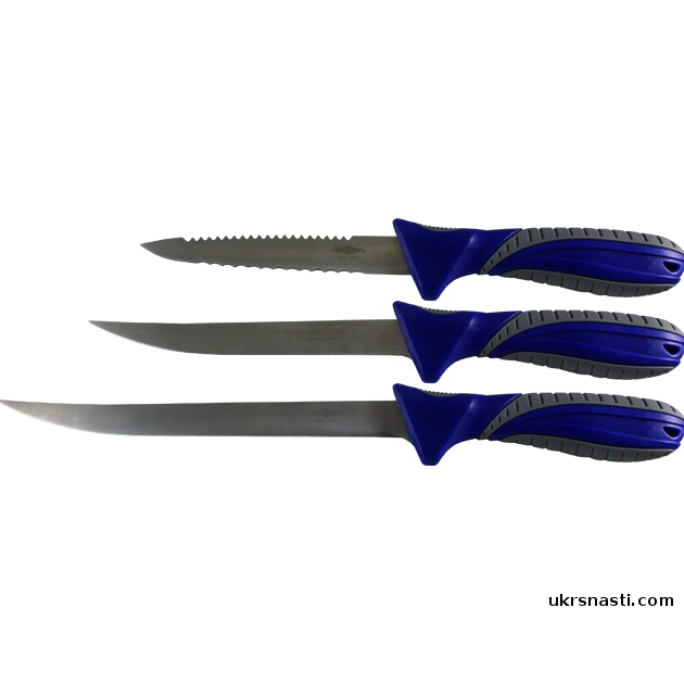 Набор из 3-х ножей для разделки и филирования. Лезвия изготовлены из высококачественной пищевой стали и заключены в обрезиненные удобные и безопасные ручки. Комплектуется набор практичным и красивым чехлом и фирменной точилкой. Складывается в плоскую «книжку» и плотно закрывается молнией. Входящий в комплект нож-пила поможет справиться с разделкой крупной рыбы. Для переноски предусмотрена ручка. Прекрасный подарок для рыболова и туриста.