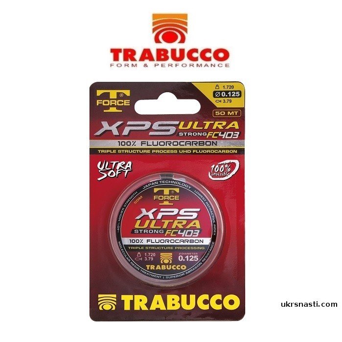 T-Force XPS Ultra Strong FC403 – уникальный флюрокарбон от производителя Trabucco, который имеет на 40% более высокую прочность на узлах, нежели другие аналоги. Благодаря своему коэффициенту преломления света, данный флюр на 100% гарантирует невидимость в толще воды. Флюрокарбон имеет трёхслойную структуру, состоящую из сердечника высокой плотности, промежуточного мягкого слоя и оболочки, обеспечивающей высокую стойкость к истиранию.