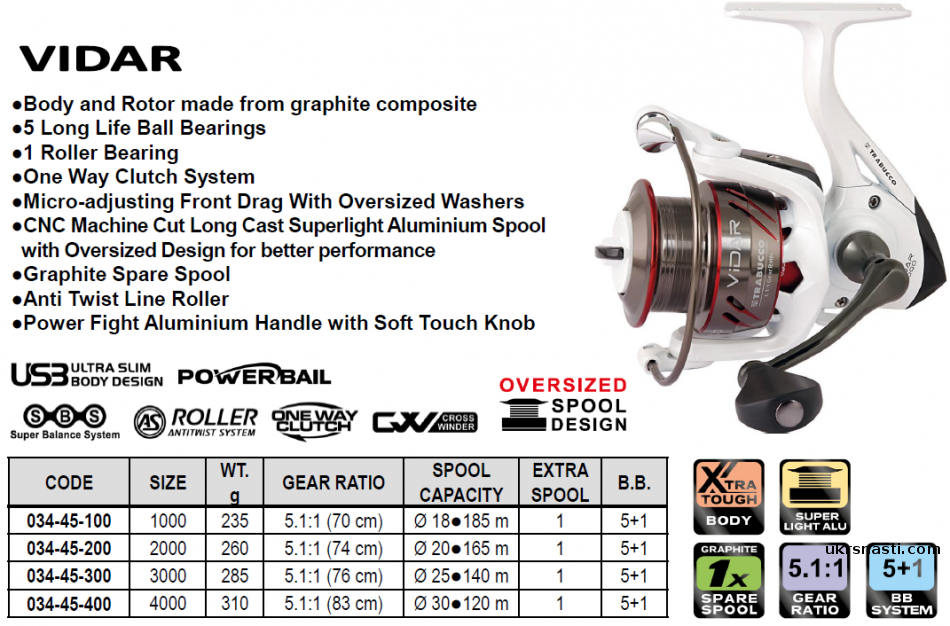 Trabucco Vidar FA – серия недорогих безынерционных катушек с передним фрикционом для универсального применения. Серия представлена четырьмя моделями, позволяющими успешно подобрать катушку как под спиннинговую, так фидерную, матчевую или вовсе карповую ловлю.