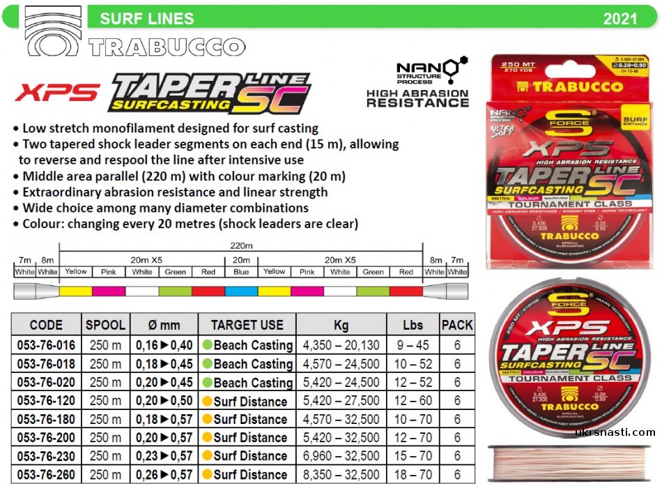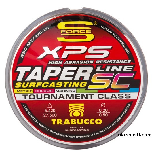 S-Force SF Surf Taper Line SC – очередная новинка 2021 года от итальянского производителя Trabucco для фанатов морской сюрфовой рыбалки. Леска обладает исключительной стойкостью на стирание и общей линейной прочностью. Цвет лески меняется каждые 20 метров. Конусная леска имеет два конических сегмента амортизатора на каждом конце, длиной 15м, позволяющих переворачивать и перематывать леску после интенсивного использования.