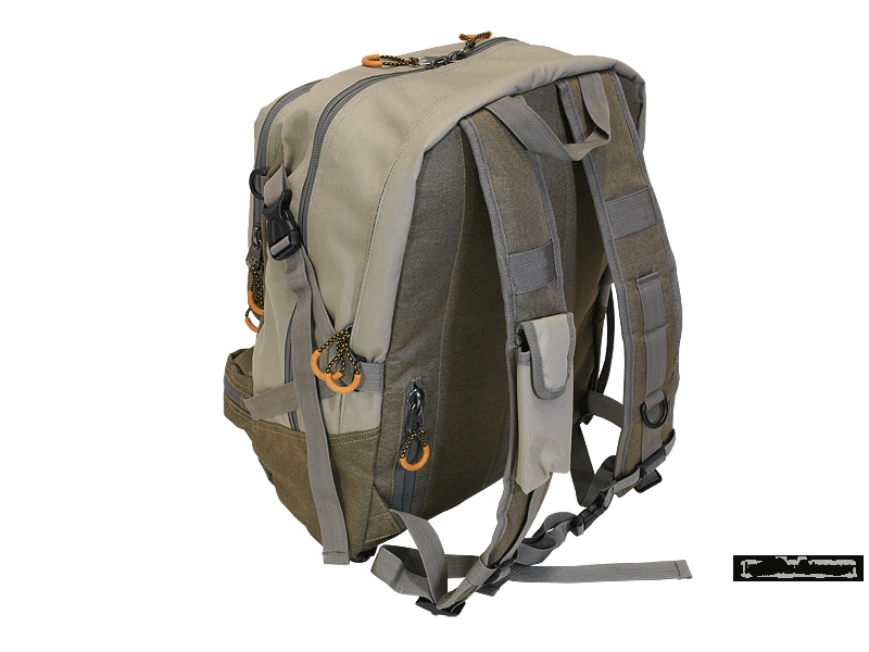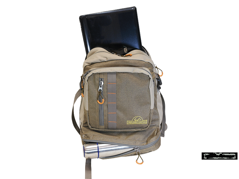 Он состоит из основного отсека, доступ к которому, оборудован двумя змейками. Внутри основного отсека находится карман для ноутбука. На внешней стороне рюкзака расположены два кармана, закрывающиеся змейками, в одном из которых свободно поместится полулитровый термос, в другом коробка для снастей средних размеров. На обратной стороне рюкзака расположен довольно глубокий потайной карман, в котором можно хранить документы и ценные вещи.