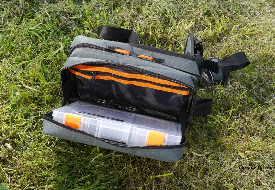 Снабжена двумя отделениями на застёжках-молниях, одно из которых снабжено пластиковой коробкой под приманки, откидывающейся на манер столика. Кроме того, в этом же отделении предусмотрен внутренний карман под документы и т. п.. Второе отделение укомплектовано специальными пластиковыми пакетами под силиконовые приманки. При желании его также можно оборудовать пластиковым боксом.