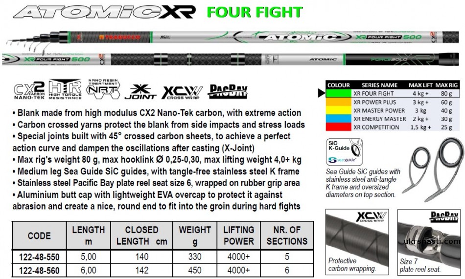 Atomic XR Four Fight BLS – серия мощных болонских удилищ, способных поднять вес до четырёх килограмм. Серия представлена двумя моделями, длиной 5 и 6 метров, которые способны забрасывать оснастку весом до 80 грамм и уверенно вываживать крупную рыбу. Удилища отлично подойдут для любителей карповой ловли и ловли на боковой кивок.