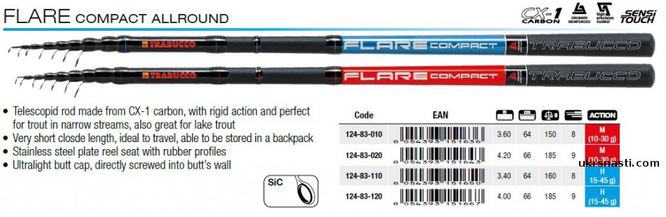 Flare Compact Allround – серия надёжных болонских удилищ для ловли в прудах, реках, море и горных ручьях. Минимальная транспортировочная длина удилищ очень удобна для рыбалки на молах и пирсах. Удилища очень компактные и лёгкие.