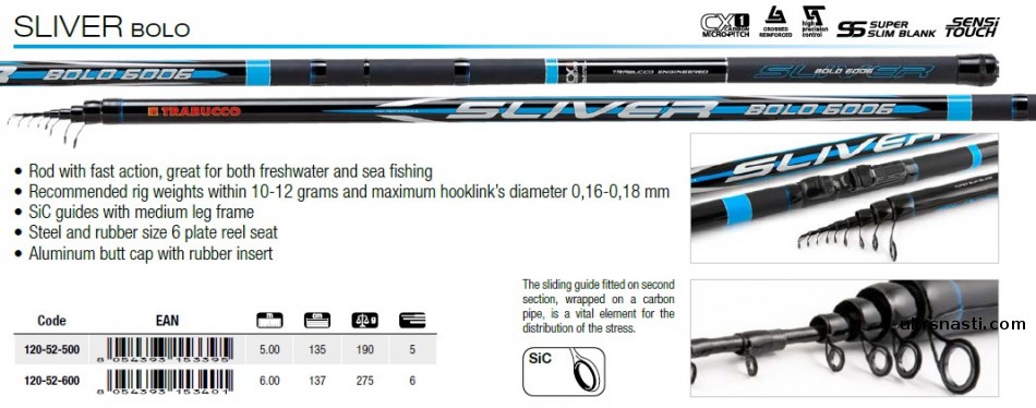 Trabucco Silver Bolo – двухмодельная серия болонских удилищ для тех, кто желает поймать крупного и активного трофея. Удилища блестяще подходят для ловли сложной рыбы в трудных условиях. Исключительной особенностью Trabucco Silver Bolo является невероятно тонкопрофильные бланки, выделяющиеся исключительной управляемостью.