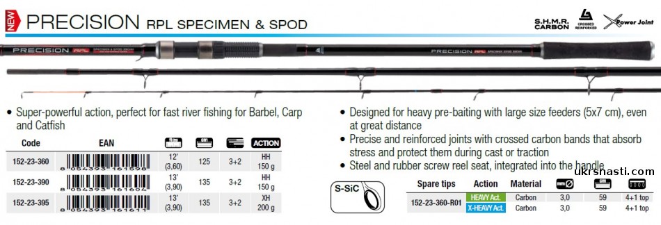 Trabucco Precision RPL Specimen and Spod – фидерные удилища для ловли крупной и сильной рыбы, такой как карп, усач и сом на каналах и реках. Удилища предназначены для ловли с тяжёлыми кормушками на больших расстояниях.