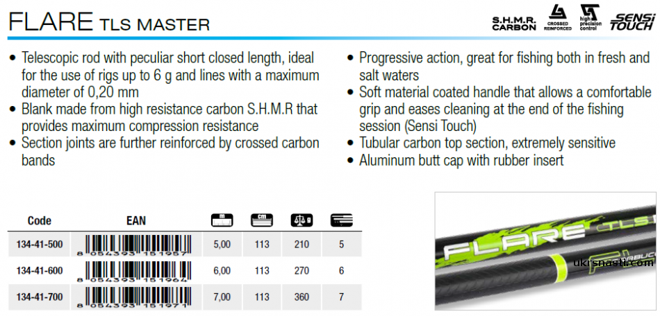 Flare TLS Master – серия телескопических удилищ без колец для фанатов маховой ловли. Серия представлена тремя моделями, выполненными на прочных и приятных в использовании бланках с быстрым и прогрессивным строем.