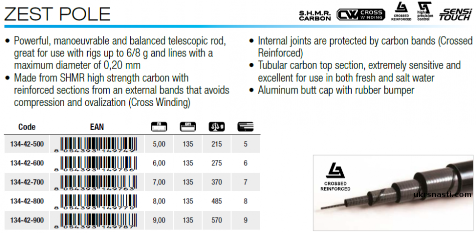 Zest Pole – серия маховых удилищ для настоящих фанатов маховой интенсивной рыбалки. Модельный ряд представлен пятью длинными моделями, которые одновременно жёсткие и лёгкие. Удилища максимально раскроют себя при ловле рыбы на реке, озере или морском побережье. На удилищах, в области кончика и второй секции отсутствует защита, что позволило добиться большей гибкости, тем самым позволив демонстрировать идеальную линию изгиба.