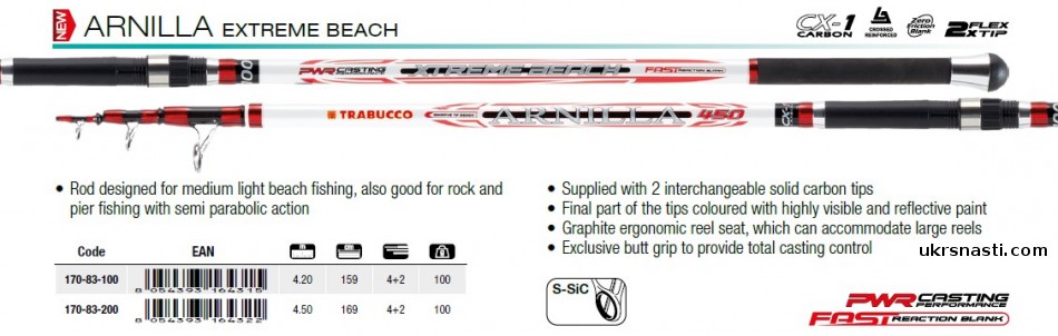 Trabucco Arnilla Extreme Beach – серия телескопических удилищ полупараболического строя для ловли со скал и пирсов. Серия представлена двумя моделями, выполненными в одном тесте, но с разной длиной. Телескопическая конструкция делает их очень удобными в транспортировке и перевозке.
