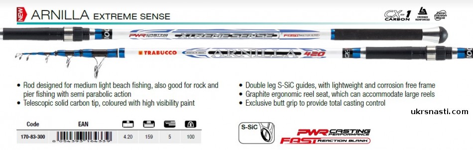 Trabucco Arnilla Extreme Sense – удобное телескопическое универсальное удилище для любителей морской рыбалки. Удилище прекрасно подходит для ловли с пляжа, пирса и скал. Обладает полупараболическим строем и отличается хорошим сочетанием цена/качество. Рекомендовано начинающим рыболовам.